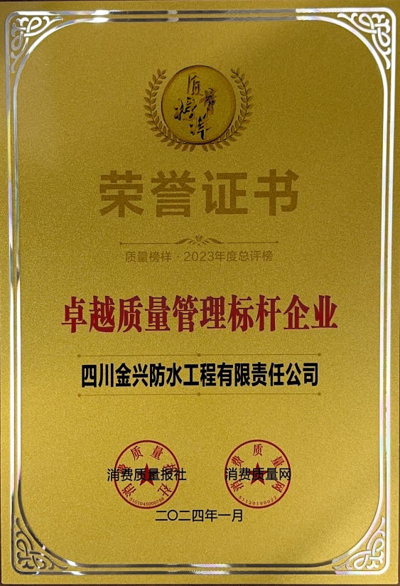 1月12日,由四川日报报业集团消费质量报联合四川省品牌建设促进会、消费质量智库联合主办的“质量提升行动四川实践研讨会暨第十三届质量榜样•2023年度总评榜”揭晓,四川金兴防水工程有限责任公司获“卓越质量管理标杆企业”称号。